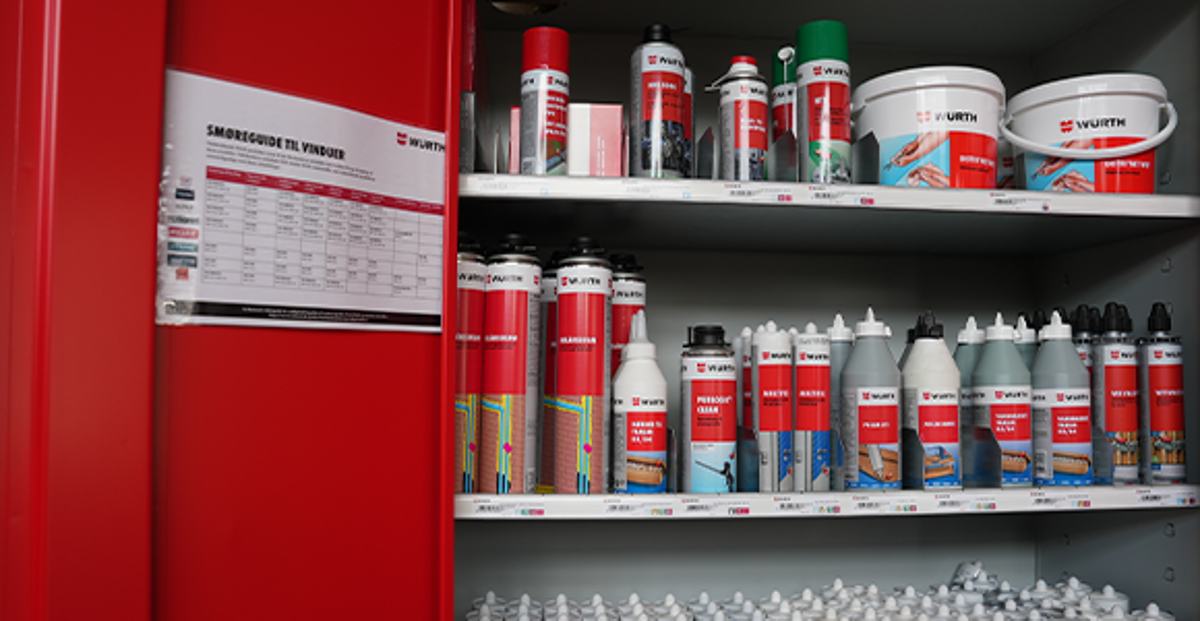 Hos Würth tilbyder vi et kemiskab, der giver dig fuldt overblik over dine kemiprodukter. I skabet har hvert produkt sin faste plads, med piktogrammer som viser hvilke værnemidler som skal benyttes. Det sikrer orden og hurtig adgang til de rette produkter, når du har brug for dem.